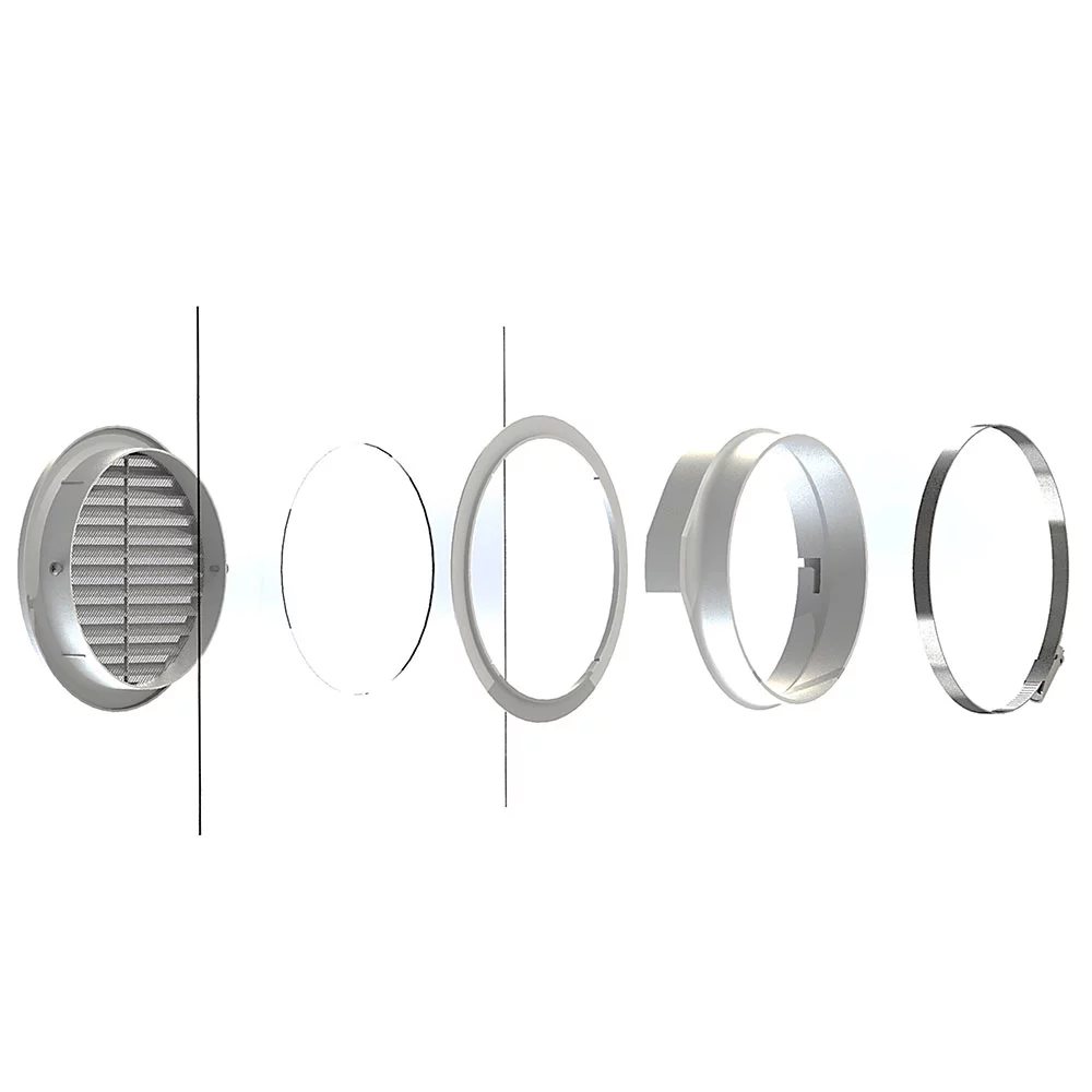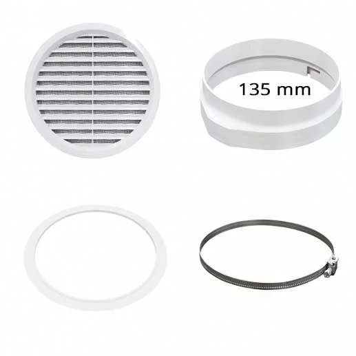 - un anneau de raccordement blanc avec fermeture à baïonnette comme adaptateur entre le tuyau d’évacuation d’air et la grille de ventilation (Ø 150 mm)