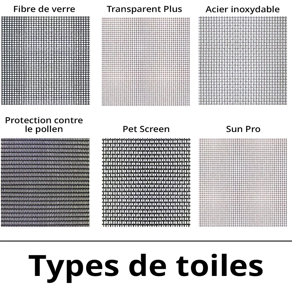 Outre la toile standard en fibre de verre, nous proposons des toiles particulièrement solides en acier inoxydable et résistantes animaux domestiques, mais aussi des types de toile particulièrement transparents et adaptés aux personnes allergiques.